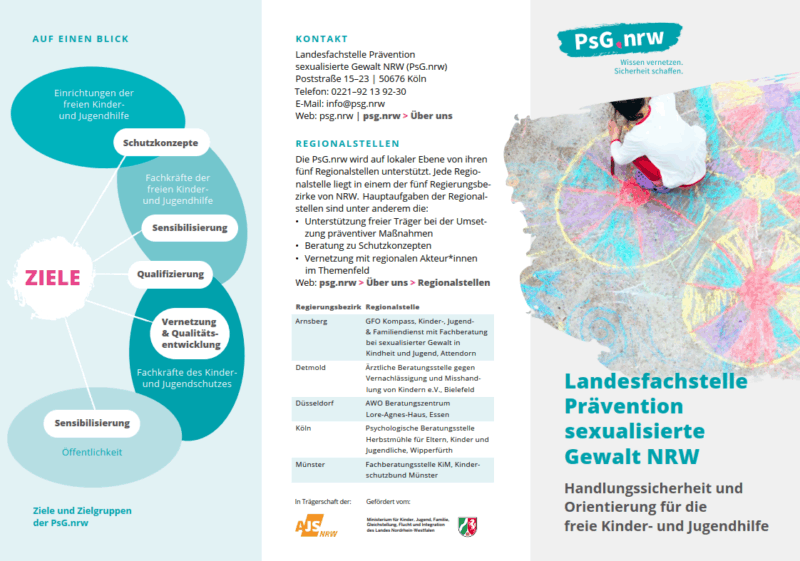 Der Schutz von Mädchen* und Jungen* obliegt uns Erwachsenen, die wir tagtäglich mit ihnen arbeiten bzw. leben. Eine einzige Person kann für ein von sexualisierter Gewalt betroffenes Kind oder einen Jugendlichen den Unterschied machen. Deswegen müssen alle Erwachsenen möglichst gut zum Thema Prävention von sexualisierter Gewalt informiert sein — getreu dem Motto der PsG.nrw: Wissen vernetzen. Sicherheit schaffen.